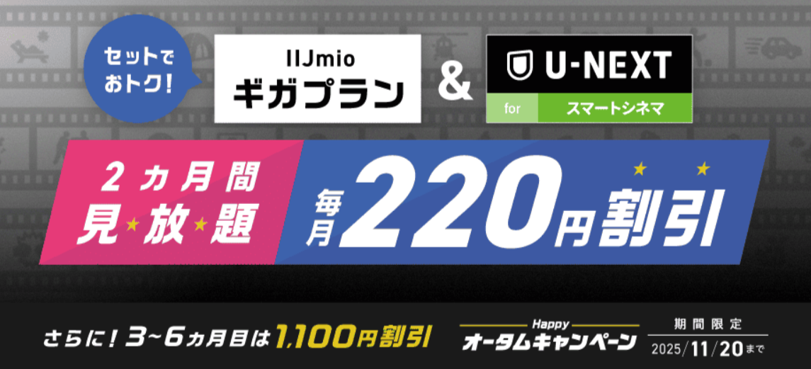 | オプションセット割引 | 終了日未定 | ギガプラン利用中に【U-NEXT for スマートシネマ】を契約すると①最大2ヵ月無料、②3~6か月は月額料金1,100円割引(11/20まで)、③オプションセット割引で月額220円割引 |