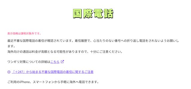 海外向けの「海外あんしん定額」と「海外パケットし放題」はデータ通信のみを対象としたプランのため、国際電話をかけた際の通話料は別途請求されます。
