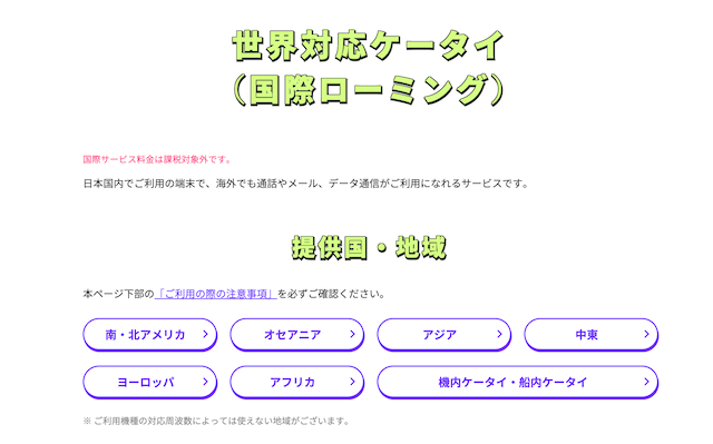| サービス提供国/ 地域 | ・北・南アメリカ ・オセアニ ・アジア ・中東 ・ヨーロッパ ・アフリカ ・衛星電話 |