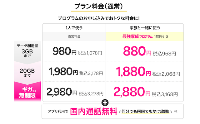 - データプラン3GB(スマホ):月額550円